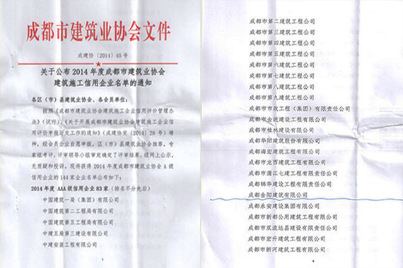 成都金陽建筑有限公司組建于1986年,是房屋建筑工程施工總承包二級、市政公用工程施工總承包三級、鋼結構工程專業承包二級、裝飾裝修工程專業承包三級、土石方工程專業承包三級資質企業。公司自成立20多年來,先后承建了30米跨度100噸級行車車間和庫房,中外合資三星級賓館、商業大樓、醫院門診大樓、教學樓、公路、鐵路、橋梁和住宅樓等工程,公司還承建了土地整理、安置房建設、道路和橋涵等多個政府投資項目。累計施工面積逾1500萬㎡,工程合格率100%,優良率達40%以上,具有較高的社會聲譽。公司先后獲得省、市、縣各級授予的“先進企業”“先進集體”“優勝企業”“明星企業” “重合同守信用企業”“納稅先進企業”“安全生產先進單位”等若干榮譽,2014年11月,公司再次榮獲成都市建筑業協會“2014年度AAA級信用企業”榮譽。(圖為文件部分掃描件)