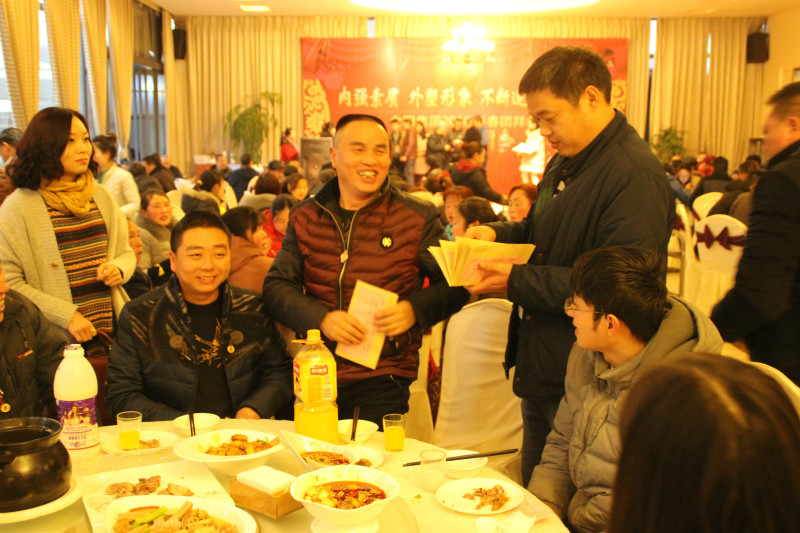 團拜會由公司員工廖盼、張勤勤主持。在子公司宣讀了2016年目標任務后,公司對在2015年工作中表現特別突出的15位優秀員工進行了表彰,并頒發了獎金和《榮譽證書》。集團各部門、各子公司自編自演了文藝節目,其間穿插四輪幸運抽獎,總經理還通過發微信紅包與全體員工進行互動。總經理鄧煉先生還在團拜會現場為全體員工派發了春節紅包。整個團拜會在一首《團結就是力量》的嘹亮歌聲中圓滿結束。(圖為團拜會現場照片)