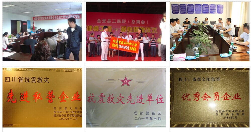 成都金陽實業集團有限公司組建于1996年。旗下有成都金陽房地產開發有限責任公司、成都金陽建筑有限公司、成都金綿物業管理有限公司等子公司,公司自組建以來,利用管理優勢,抓住機遇,積極投入房地產開發,取得了可喜的業績,并以此帶動了公司相關產業的快速發展,從而成為當地的優勢企業和納稅大戶。公司在為地方經濟發展作出巨大貢獻的同時,還熱心于社會公益事業,投巨資打造了“金陽公園”,為市民提供了優美的休閑環境,同時在解決下崗工人和失地農民就業、支援災區、幫助貧困家庭度過難關、資助貧困學子圓大學夢等方面都積極伸出援助之手。公司以“堅持管理創新、依靠科技進步、建設企業文化、推動金陽騰飛”的經營理念,不斷向更高的目標邁進,2008年3月,金陽集團向工業化前進的步伐進一步加快。公司連續數年被評為成都市“重合同、守信用企業”和省、市、縣的“明星企業”、“先進企業”、“優勝企業”、“慈善企業”。獲得各種榮譽80多項。
